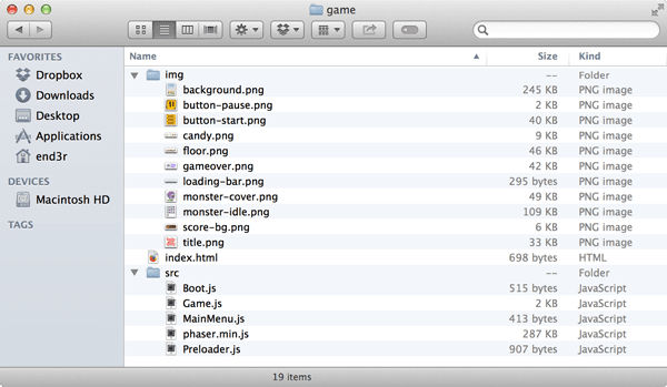 보시다시피, 하나의 주요 자바 스크립트 게임 객체가 만들어졌으며 많은 다른 객체가 특수 목적으로 할당되었습니다. 우리 게임에서는 Boot, Preloader, MainMenu 및 Game 객체가 게임 상태가되며 프로토 타입을 사용하여 정의합니다. 프레임 워크 자체 (preload (), create (), update () 및 render ()) 용으로 예약 된 객체에는 몇 가지 특수 함수 이름이 있지만, 자체 startGame (), spawnCandy managePause ()). 이 모든 것을 잘 이해하지 못한다면 걱정하지 마십시오. 나중에 코드 예제를 사용하여 모든 것을 설명 할 것입니다.